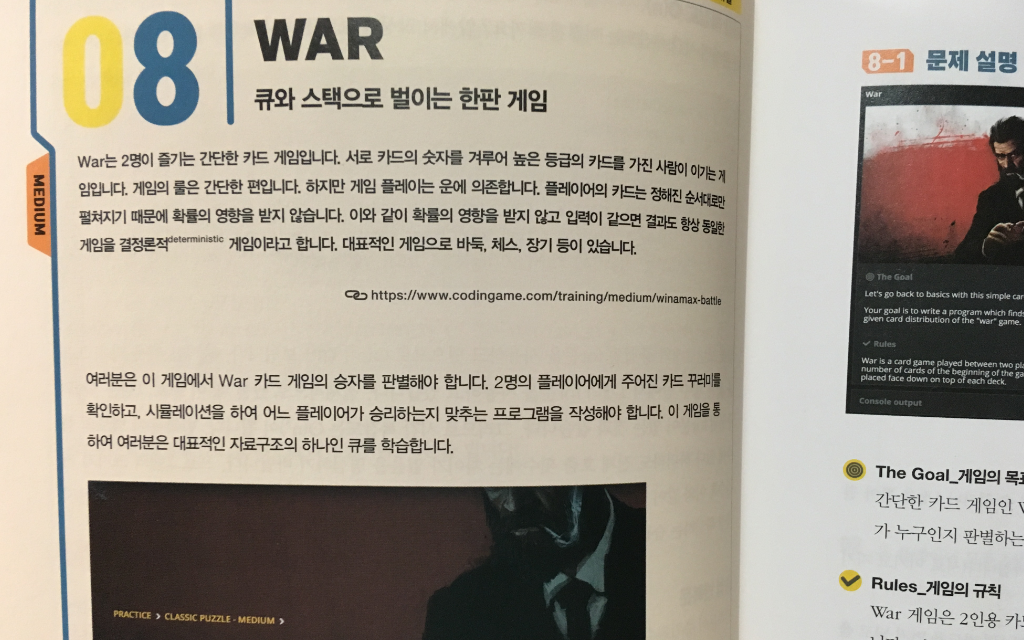 드디어 알고리즘이라는 것을 접해 봅니다. 들어만 봤지 실제로 책을 접해 보기는 처음입니다. 그것도 게임이라니 흥미가 동하네요. 노란색 = 병아리 = 초보를 의식한 것일까요? 지금까지 프로젝트 몇 건을 하면서 현장에서 알고리즘에 대한 이야기를 제대로 들어 본 적이 없지만, 중요하다는 것은 어렴풋이 느끼고 있었기에 알고리즘을 들여다볼 수 있는 좋은 기회였습니다.