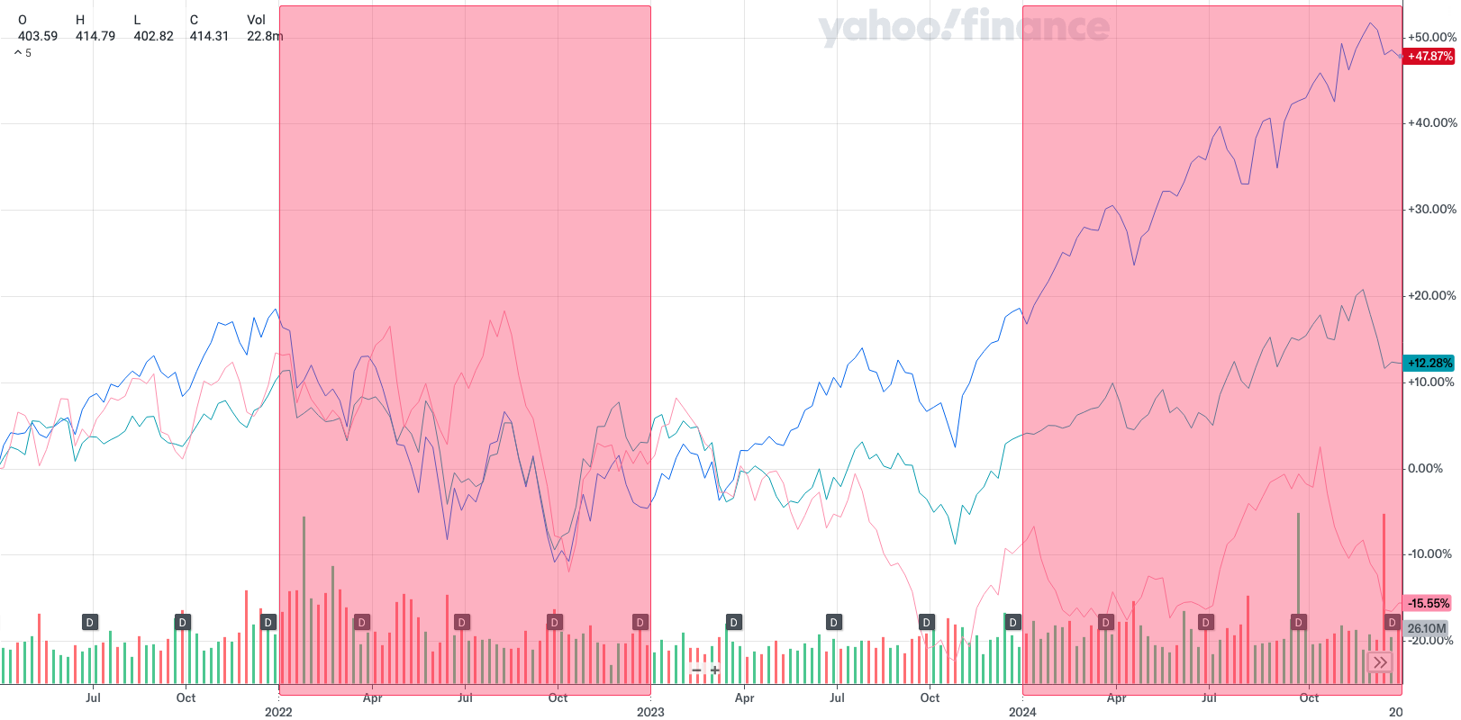 21년 미국주식을 시작한 이후의 추세를 보니 3년을 버티고 4년째가 되니 VOO의 추세가 월등하다. 더 모으고 싶지만 주가도 주가지만 계엄선포 이후로 미친 듯이 뛰어버린 환율로 접근이 어렵다.