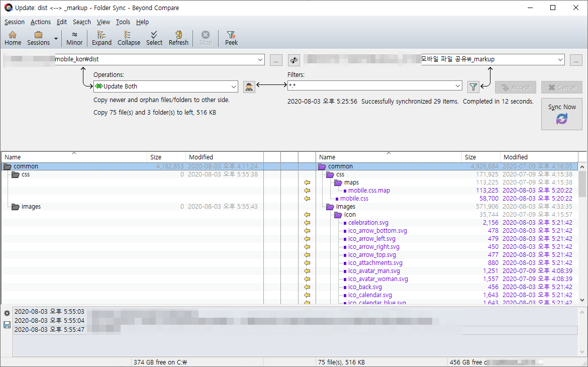 폴더 간 파일 비교도 가능해서 무척 요긴하게 사용하고 있습니다. 날짜만 다른 경우에 대한 필터도 가능하기 때문에 무척 쓸만했습니다.